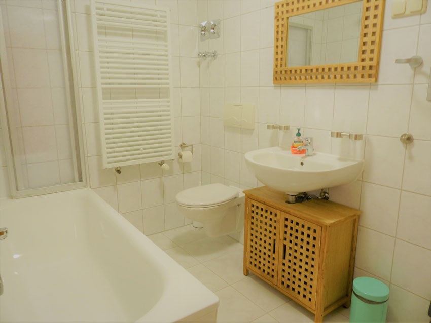 Küchenausstattung: Herd, Geschirrspüler, Mikrowelle, Kaffeemaschine, Wasserkocher, Toaster, Kühlschrank (Geschirr und Besteck, Töpfe ... vorhanden)