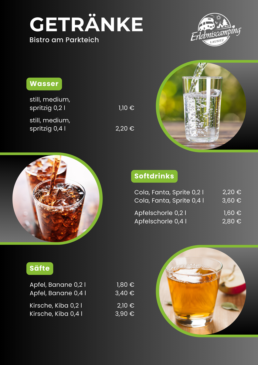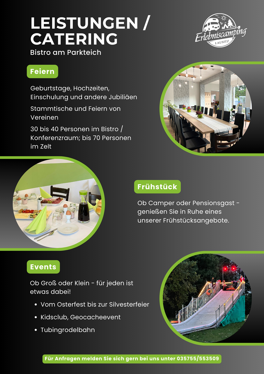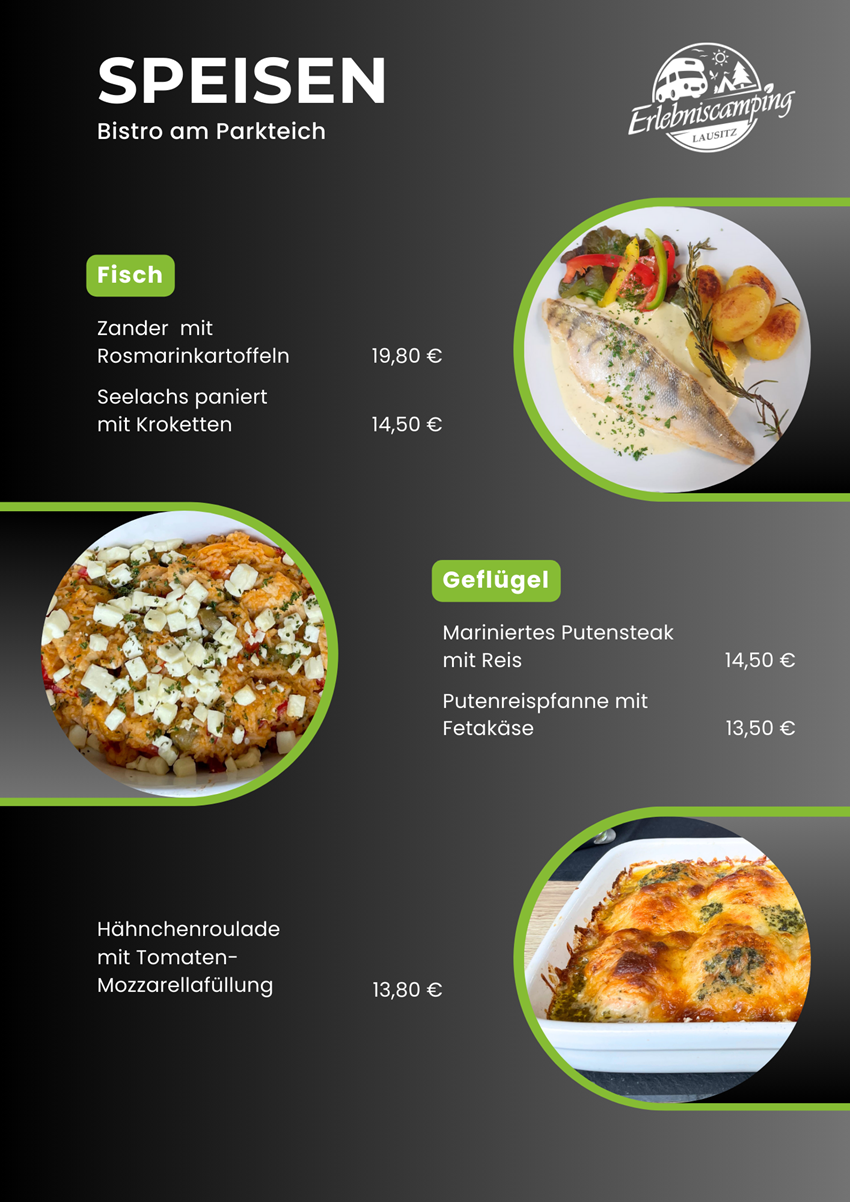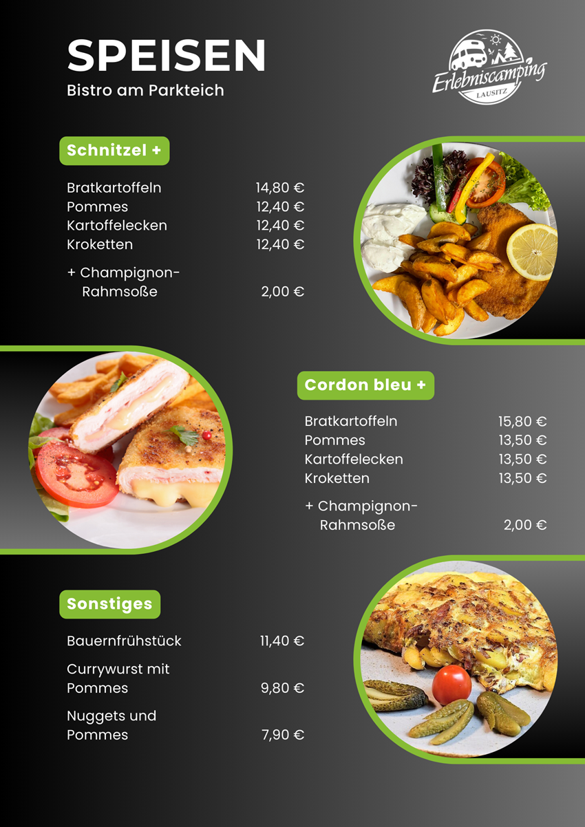 Das Bistro des Erlebniscamping Lausitz befindet sich im Hauptgebäude auf dem Campingplatz in Ortrand. Die Innenräume sind gemütlich und modern für 26 bis 30 Gäste eingerichtet. Im Biergarten finden an warmen Tagen weitere Gäste Genuss unter freiem Himmel. Das kleine Restaurant ist ebenerdig gelegen und stufenlos erreichbar. Ein barrierefreies Gäste-WC steht zusätzlich zur Verfügung. Unsere Gäste können Ihre Pkw`s kostenfrei auf dem Außenparkplatz abstellen. Fahrradständer sind vorhanden. Die Speisekarte wird saisonal ergänzt durch besondere Tagesgerichte wie Lamm-Spezialitäten, Spargel-Gerichte oder Gänsekeule mit Rotkraut und Klößen.