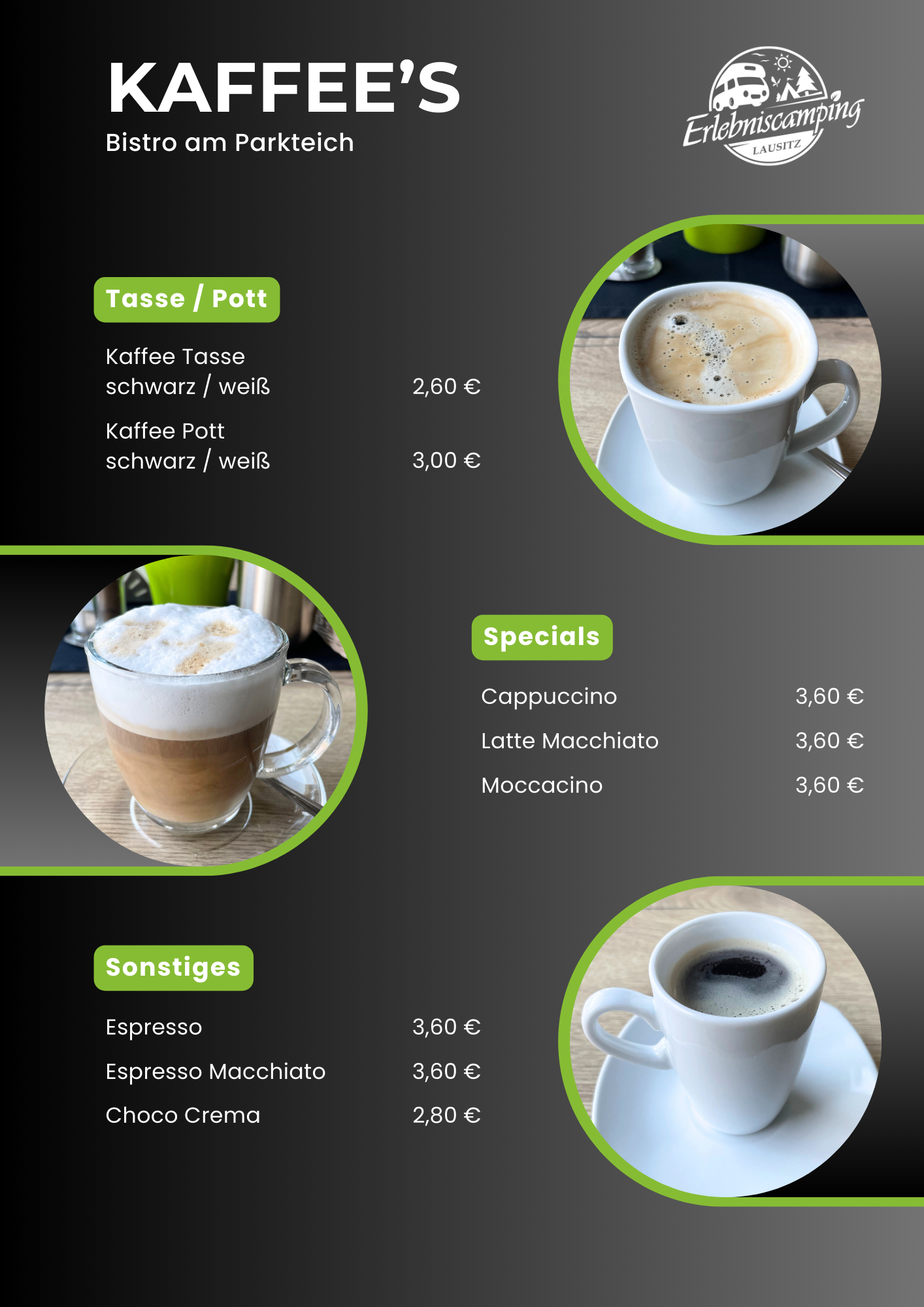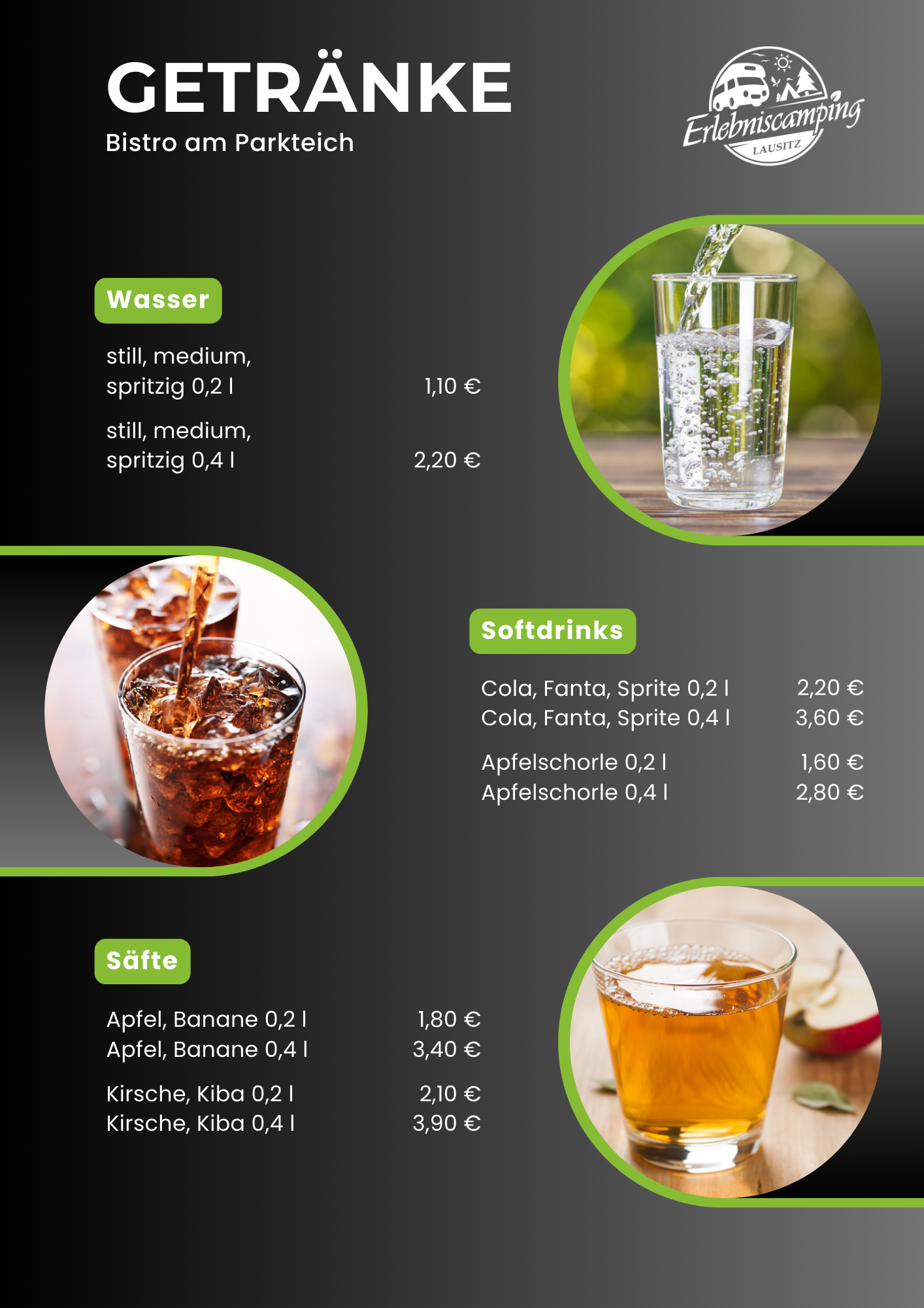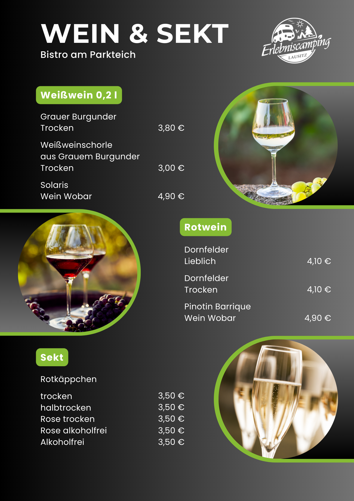 Das Bistro des Erlebniscamping Lausitz befindet sich im Hauptgebäude auf dem Campingplatz in Ortrand. Die Innenräume sind gemütlich und modern für 26 bis 30 Gäste eingerichtet. Im Biergarten finden an warmen Tagen weitere Gäste Genuss unter freiem Himmel. Das kleine Restaurant ist ebenerdig gelegen und stufenlos erreichbar. Ein barrierefreies Gäste-WC steht zusätzlich zur Verfügung. Unsere Gäste können Ihre Pkw`s kostenfrei auf dem Außenparkplatz abstellen. Fahrradständer sind vorhanden. Die Speisekarte wird saisonal ergänzt durch besondere Tagesgerichte wie Lamm-Spezialitäten, Spargel-Gerichte oder Gänsekeule mit Rotkraut und Klößen.